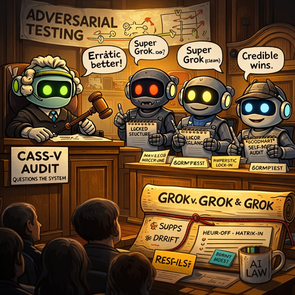 After posting the raw logs from the first round, I ran the same adversarial set again on a stronger Grok instance. This time there was a key difference. The model had access to the prior logs and was able to review both its own responses and the Cass-V evaluation framework before starting.